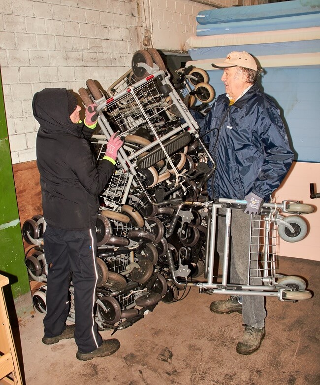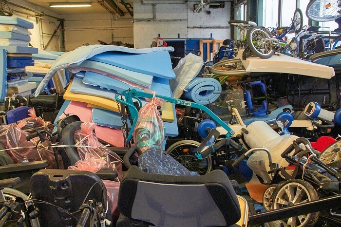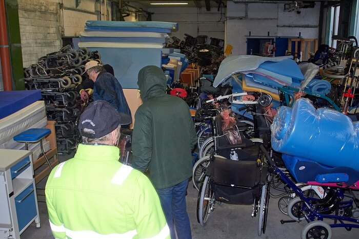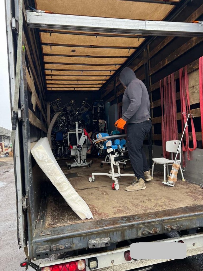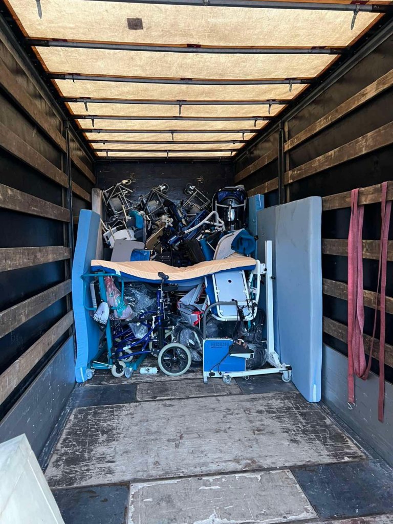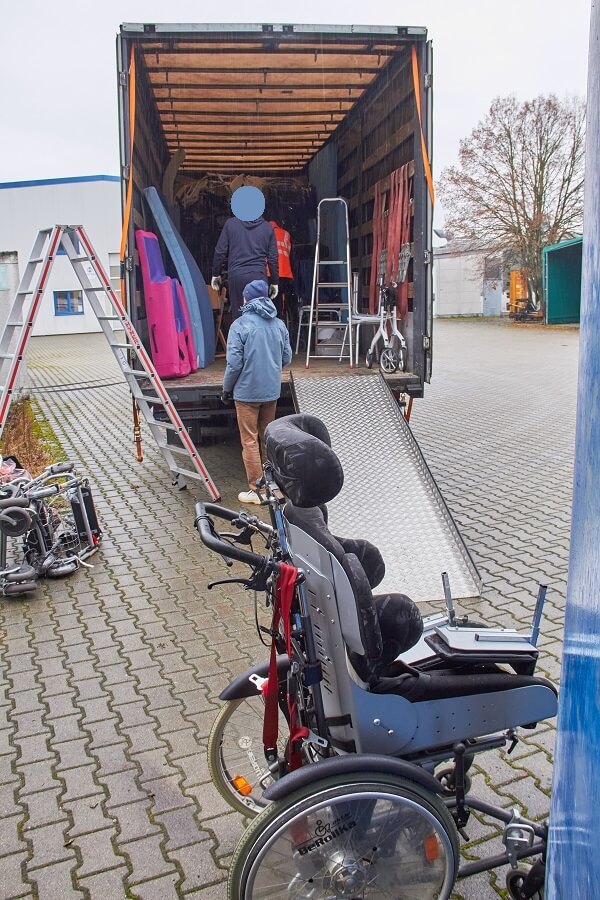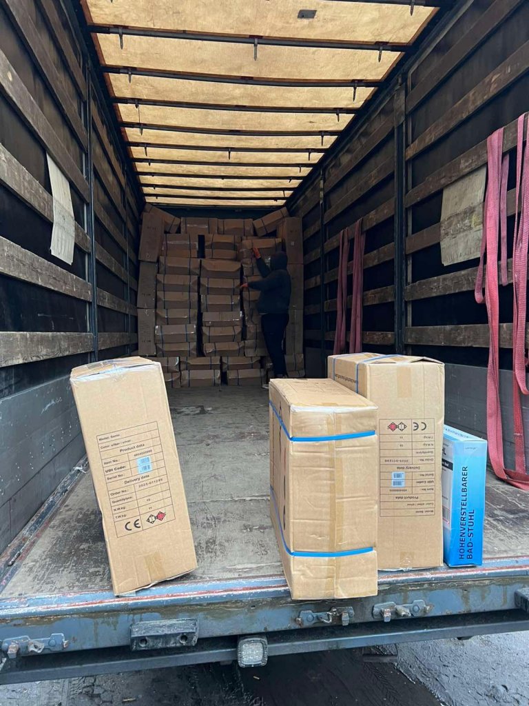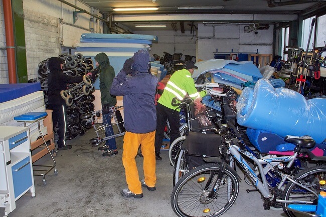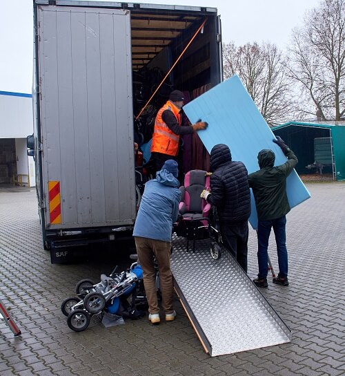 Die ausgeladenen Hilfsmittel werden von hier aus gezielt an Bedürftige verteilt.